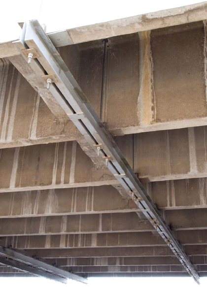 6. 现浇桥面铺装层及伸缩缝。桥面铺装采用一次性重新铺设,并在桥面铺装层中铺设柔性防水层,防止表层水渗人。同时新做铺装层增加了主梁截面有效高度,提高了桥梁的竖向钢度。