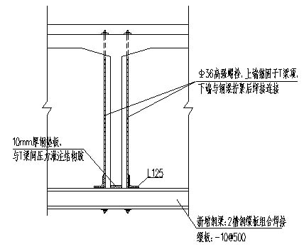 3. T梁底增设横向钢梁。每跨均增设4根钢梁,跨中增设双根钢梁,L/4及3L/4处增设单根钢梁。钢梁采用2根φ36高强螺栓穿透桥面板与每片T梁连接。以改善桥梁横向分布状况,提高上部结构整体工作性能,并可减小主梁的荷载效应。