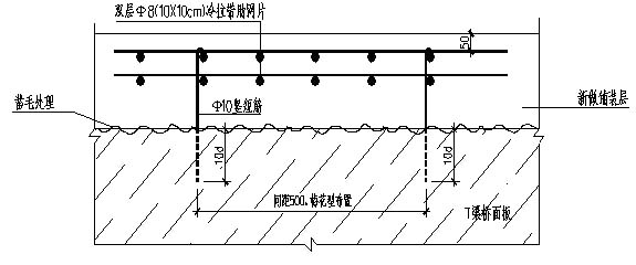 φ10@500竖短筋,筋下端植入T梁顶面:以增强桥面铺装层与T梁间的抗剪切能力。
