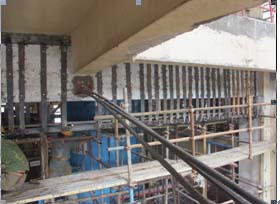 ③框架柱在地震作用下加固,采用湿式外包钢加固工艺柱角包角钢,中间设置缀板,较大的提高了结构刚度很好的满足了受力需要,并大大缩短了施工工期,解决业主工期要求紧的难题。