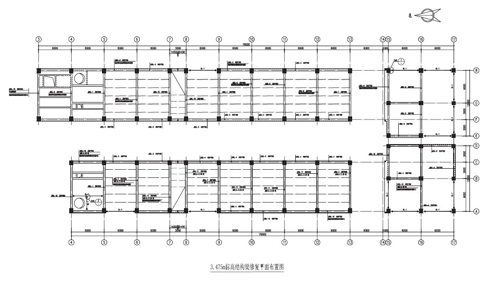 本工程山西省某化工厂聚合车间厂房修复工程,结构由于受到燃烧和小范围爆炸影响,A~C/1~17轴范围内的结构构件受到较大冲击,受甲方委托,我院对此结构进行修复设计。甲方提供原有结构图纸。