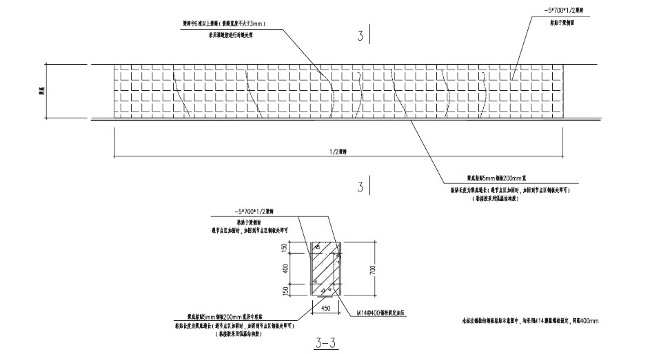 3.梁的加固箍条与次梁(或钢梁)有做法冲突时,箍条避开处理,并在次梁(或钢梁)两侧做箍筋加强处理